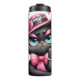 Diese humorvolle Abbildung zeigt eine schwarze Katze mit einem grauenhaften Ausdruck und großen blauen Augen. Die Katze trägt einen breit gebrannten rosa Hut, einen passenden Bogen und ein Perlenarmband. Es ist von verstreuten rosa Herzen, einem kleinen zornigen blauen Vogel und einem rosa Vogel mit großen Augen umgeben, was eine skurrile und sarkastische Urlaubsszene schafft
