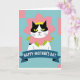 This card features a stylized two-tone cat centered on the front, with a white body and sharp black markings across its head and pointed ears. A large, soft pink flower crown with fresh green leaves circles its face, adding a sweet, affectionate touch that contrasts with the cat’s unimpressed look. The narrowed yellow eyes and slight frown give it a dry, funny charm, like it’s accepting the attention with quiet loyalty rather than gushing emotion ❤️. The background is a calm light blue, keeping the scene airy and open. Near the top corners, small pink rectangles add simple accents without pulling focus from the character. Along the bottom, a deep blue banner stretches across the width, and the words “HAPPY MOTHER’S DAY” appear in white, all-cap letters centered on the banner 🌼. The pink crown sits high around the cat’s head, with rounded petals layered over one another and green leaves peeking out between the blooms.