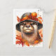 Auf dieser Postkarte befindet sich ein mürrisch aussehender Otter mit einem Hut, der mit Elementen der Herbstsaison geschmückt ist. Ein amüsantes Herbst-Kern-Kunstwerk für Otter-Liebhaber, Herbstbegeisterte und Fans von feinen Tierdarstellungen. Die warmen Farben Rot, Orange und Braun, die Herbstblätter, ein kleiner Kürbis und rote Beeren sorgen für ein saisonales botanisches Wildtierdesign.