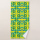 Ist hier ein lebhafter Badtuchentwurf mit einem playful geometrischen abstrakten Muster der Überschneidung der farbigen Hexagone in den Schatten von Grünem, von Gelbem, von Blauem, Türkis und Chartreuse.