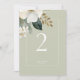 Schick und elegant. Diese wunderschöne Salbei-grüne Tischnummer mit einem hübschen Blumenstrauß mit Aquarellgoldakzenten. Das Design umfasst einen zeitgenössischen Schriftart in der Imitation von Set aus Gold in einem dünnen weißen Rahmen. Das Design wird hinten wiederholt.