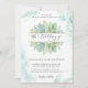 Elegante und einzigartige Hochzeitseinladung mit exquisitem Aquarell in sanften, türkisfarbenen, aqua- und staubblauen Tönen. Attraktive botanische Vegetation in der Mitte in hellblau, grün, sage und limigrün. Golddetails in Blätter und farbige Fesseln. Moderne handgeschriebene Kalligrafieelemente. Zurück in elegantem, blassgrünem Ton. Teil unserer Kollektion "Airy Blue and Green Watercolor" mit einer Vielzahl von Koordinierungsprodukten.
