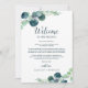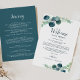 Diese üppig grüne Hochzeitsbegrüßung und die Karten für den Ausflug sind perfekt für eine elegante Hochzeit im Hinterhof. Das moderne botanische Design besticht durch herrliche Aquarellblaue Eukalyptusbäume und grüne Blätter. Auf der Vorderseite der Karte befindet sich ein Begrüßungsschreiben, auf der Rückseite der Karte befindet sich der Hochzeitstag. Diese Noten sind ideal für Hochzeiten in Urlaubsort und Begrüßungstaschen für Hotelgäste.