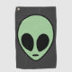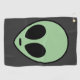 Einfache grüne Alien mit großen schwarzen Augen und einem kleinen schwarzen Mund auf dunkelgrauem Hintergrund.