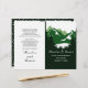 Grüne Berge und Feste gefaltetes Hochzeitsprogramm. Ein trendiges und dennoch elegantes Hochzeitsdesign mit einer Bergkette durch Koniferen und Ihre Namen in handgeschriebenem Stil. Im Inneren befinden sich dunkelgrüne und weiße Ränder mit Polka-Punkten und weißen Rahmen mit Ihrem Text.