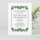 Eine hübsche, weiße Einladung mit Rändern von grünen Blätter. Setzen Sie die Vornamen des Paares auf einer Seite mit allen Informationen und Begrüßungen der Mutter und des Vaters der Braut. Bitte dreimal Karo deinen ganzen Text.