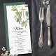 Die Speisekarte des Botanischen Kreuzes im Grünen bietet ein weißes Kreuz auf grünen, von Hand bemalten Eukalyptus-Blätter und Grünpflanzen mit den unten stehenden Menüinformationen. Personalisieren Sie den Text durch Bearbeiten in den bereitgestellten Textfeldern. Designed by ©2022 Evco Studio www.zazzle.com/store/evcostudio