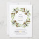 Grüner, blumenreicher Weihnachtskranz mit weißen Rosen, Nadelkronen und einer modernen, grünen Weihnachtsfeier. Essen, trinken und fröhlich sein, moderne Typografie in Grau und Gold - minimalistisch Urlaub Einladung Design.