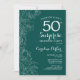 Aquamarine grüne Überraschung 50. Geburtstagsparty Einladung. Minimalistisches modernes Design mit botanischen Akzenten und Typografie-Script-Schriftart. Einfache florale Einladungskarte perfekt für eine stilvolle weibliche Überraschung am Tag. Kann für jedes Alter angepasst werden. Gedruckte Zazzle Einladungen oder Sofortdownload digitalen Vorlage.