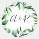 Dieser runde Aufkleber enthält handgeschriebene Stilinitialen, umgeben von grünem Eukalyptus-Blattwerk, auf weißem Hintergrund. Dies ist Teil einer passenden Hochzeitssuite. Sie können die Initialen im Menü "Anpassen" ändern.