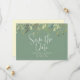 Moderne Save the Date Ankündigungen verfügen über Aquarellfarben-Eukalyptus-Blätter, die auf grünem Hintergrund mit grünen, anpassbaren Textblöcken in modernen Schriftart angeordnet sind. Fügen Sie den QR-Code der Hochzeitswebsite auf der Rückseite hinzu.