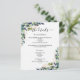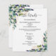 Eine moderne, elegante Hochzeitsdetails/Programm/Zeitleiste. Weiße, mit Eukalyptusgrün und goldgelbem Blattwerk dekorierte Räume. Personalisieren und fügen Sie Ihre Namen und Hochzeitsdetails. Schwarze Buchstaben. Text auf beiden Seiten. Fügen Sie Ihre Hochzeitswebsite url zum QR-Code auf der Rückseite hinzu. 1 Blatt = 1 Programm, mit der Kante bis Kante bedruckt.