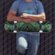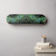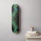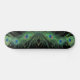 Phantastisches Pfauenfederskateboard mit schwarzem Hintergrund. Dieses Stillleben der drei Pfauenfedern sieht vor dem schwarzen Hintergrund phantastisch aus. Die kräftigen grünen und blauen Farben der Pfauenfeder sind lebendig und so elegant.