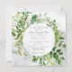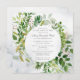 Elegante moderne Beerdigungseinladung mit einem grünen und grauen runden botanischen Rahmen. Eine weiche graue Wasserfarbe verleiht ihm eine ruhige und würdige Luft. Der Name des Verstorbenen wird in einem traditionellen Skripttext geschrieben. Der gesamte Text kann leicht bearbeitet werden, um eine persönliche Erinnerung zu schaffen.