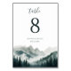 Begrüßen Sie Ihre Gäste auf ihren Plätzen mit der atmosphärischen Schönheit der Verdant Peaks | Watercolor Table Number. Diese elegante Karte zeigt eine handgemalte Landschaft aus nebelverhangenen immergrünen Wäldern und hoch aufragenden Berggipfeln und fängt den Geist der Wildnis perfekt ein.