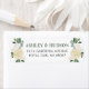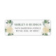 Stilvolle Hochzeitsstipps mit eigenem, reich grün und weich personalisiertem Rücksendeadressen-Aufkleber, gerahmt durch ein florales Aquarelldesign mit bemalten Rose, ranunculus Blume und Blattwerk. Das Farbschema umfasst weiche Farben wie Weiß, Creme, Gold und Grün.