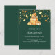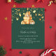 Eine Einladung für ein Weihnachtsfest. Ein grüner Hintergrund. Mit goldenen Sternen und einem Stapel Geschenke dekoriert. Personalisieren und fügen Sie die Details hinzu. Weißer Text. 1 Blatt = 1 Einladung mit Druckkante bis Kante.