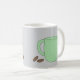 Eine grüne Kaffeetasse mit Kaffeebohnen.