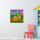 Poster in einer niedlichen Ingwerkatze mit grünen Augen, in einem Sommergarten aus roten Sternen und lila Hyazinthen