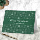 Diese grüne, moderne Schneeflocken fröhliche Weihnachtskarte hat weiße Schneeflocken auf grünem Hintergrund mit den Worten frohe Weihnachten in Weiß in der Mitte geschrieben, es gibt auch Platz unter, um Ihren Familiennamen anzupassen. Gute Nachricht an alle.