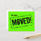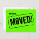 Grüne Postkarten für Neon zum Adressenwechsel. Neue Hauspostkarten mit Aufmerksamkeit, die Farben bekommt. Helles grünes Design mit Gummidruck in der Briefmarke. Benutzerdefinierter bewegter Text; Wir sind umgezogen! Fügen Sie Ihre neue Adresse auf der Rückseite ein. Moderne Karten für Zuhause und Business.