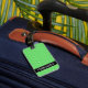 Dieses GepäckanhängerAusrüstungsbeschreibungen, die ein vieles Mustermiteinbeziehen Grün punktiert,/einkreist. Es kennzeichnet auch einen personalisierten Namen auf der Front und personalisierte Kontaktdetails über die Rückseite.