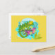 Eine Postkarte mit einer niedlichen Abbildung einer grünen tropischen Eidechse, umgeben von Blätter und Blume in türkisblauer Farbe.