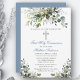 Moderne Elegante Erste Heilige Kommunion Einladung beinhaltet Aquarellfarben Eukalyptus-Blätter und andere schöne botanische Grünpflanzen. Silberkreuz. Dusty Blue Back.