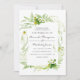 Grün-weiße Hochzeitseinladung mit Farne, Wildblumen und Erdbeeren und einem schlängelgrünen Aquarell-Waschhintergrund.