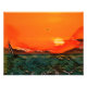 Orangefarbener Himmel mit hellgelber Sonne, die Ozeanwellen und Segelboote treffen. Das Bild von Key West, Florida, USA wurde so bearbeitet, dass es wie ein Gemälde oder eine Illustration aussah.