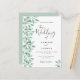 Eine trendige botanische Hochzeitseinladung in Weiß und Grün. Ein schick weißer Hintergrund auf der Vorderseite. Dekoriert mit wasserfarbenem Grün, Laub, Federn. Moderne, große handhabete Schrift, Typografie mit dem Text: Die Hochzeit von. Vorlagen für Ihre Vornamen und Hochzeitsdetails. Dunkelgrauer Text. Zurück: hellgrüner Hintergrund. Tipp: Wenn Sie es nicht so gewollt haben, dass es wie eine Postkarte aussieht, klicken Sie auf Anpassen, gehen Sie auf die Rückseite und entfernen Sie den Trenner und posten Sie die Briefmarke.