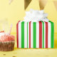 Das Verpackungspapier ist mit einem weihnachtlich Muster aus roten, weißen und grünen Streifen versehen. Es könnte Spaß machen, so ein Verpackungspapier zu verwenden, wenn Geschenke oder Geschenke, die bei der Feier eines Geburtstages, einer Hochzeit, einem Jahrestag oder einer anderen Veranstaltung gegeben werden.
