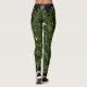 Ein lustiges Paar Leggings während der Feriensaison zu tragen. Goldstars und rote Baubelschmuck hängen von einem festlich grün dekorierten Weihnachtsbaum.