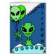 Die alles Gute zum Geburtstagkarte, die ein grinsendes grünes alien in einem blauen Saucer kennzeichnet, formte den Gegenstand, der 3 grüne alienballone hält. Das "glückliche" Wort ist oben in einem futuristischen Schriftart und im Wort "Geburtstag" in der Vertikale auf dem Recht. Einblick, dort sind keine Wörter (perfekt für Ihre eigene Mitteilung), aber die Illustration von der Front ist am niedrigeren Recht in einer kleineren Form.