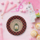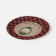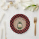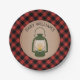 Babyduschen-Papier-Teller, der eine Illustration einer grünen Campingslaterne mit einem karierten Hintergrund des roten und schwarzen Holzfällers kennzeichnet.