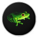 Ein gebrochener grüner Frosch mit feurigen orangen Augen vor schwarzem Hintergrund.