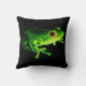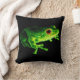 Ein gebrochener grüner Frosch mit feurigen orangen Augen vor schwarzem Hintergrund.