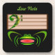 Notenblätter mit einem Bullenfrosch als ganzer niedriger Note und einem Kaulquappen als Basskleber. Die Farben sind in Grüntöne und Gelb für die Frösche und eine verschwommene braun für die Blechlinien.