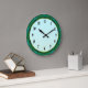 Die elegante, interessante Wanduhr besticht durch einen dramatischen abstrakten Rahmen aus grünen, blauen, indigofarbenen und gelben Kurven rund um ein helltürkisfarbenes Zentrum. Die Zahlen können gelöscht werden, wenn ein einfacheres Design bevorzugt wird. Dieses Muster funktioniert am besten bei den runden Uhren.