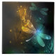 Flug von leuchtender, grüner, künstlerisch gezeichnet Libelle mit durchsichtigen grünen und gelben Flügeln auf glühendem nächtlichen Hintergrund mit marschfarbenen Pflanze und Glühwürmchen. Glühende Libelle.
