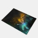 Flug von leuchtender, grüner, künstlerisch gezeichnet Libelle mit durchsichtigen grünen und gelben Flügeln auf glühendem nächtlichen Hintergrund mit marschfarbenen Pflanze und Glühwürmchen. Glühende Libelle.