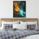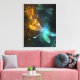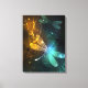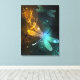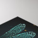 Flug von leuchtender, grüner, künstlerisch gezeichnet Libelle mit durchsichtigen grünen und gelben Flügeln auf glühendem nächtlichen Hintergrund mit marschfarbenen Pflanze und Glühwürmchen. Glühende Libelle.