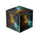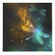 Flug von leuchtender, grüner, künstlerisch gezeichnet Libelle mit durchsichtigen grünen und gelben Flügeln auf glühendem nächtlichen Hintergrund mit marschfarbenen Pflanze und Glühwürmchen. Glühende Libelle.