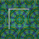 Diese magischen, mysteriösen, mystischen dennoch modernen GewebeAusrüstungsbeschreibungen, die ein glänzend farbiges geometrisches dreidimensionales kreisförmiges abstraktes Mandalamuster des überschneidenkaleidoskops in Grünem kurvt und einkreist, blau, Gold, Türkis und Gelb.