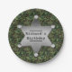 Dieser kundengerechte Camouflagemuster-Papierplattenentwurf hat eine Metallsheriff-Abzeichengraphik mit Raum, damit Sie Ihre Partyinformationen addieren. Die Tarnung ist in den grünen Abstufungen und im Braun. Es ist ein großer Entwurf für eine Person im Militär-/das Kind der Militärperson, des Veterans, der Frau oder des Mannes in der Gesetzesvollstreckung, des Jägers oder sogar des Fans populärer Fernsehshows mit Zombies.