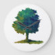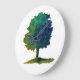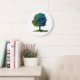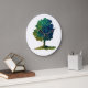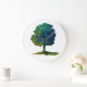 Ein erdiger grüner Schattenspender in vielen Schattierungen, hat Gras unter sich wachsen und ist auf der Uhr zentriert, die schwarze Zeiger hat, um die Zeit anzuzeigen.