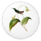 Ein hellgrüner Kolibri mit einem roten Schwanz steht auf dem Ast einer tropischen Pflanze mit gelben Blumen.