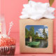 Souvenir Foto Aufkleber eines kleinen grünen Bootes und eine Holzhütte mit einigen hohen Bäumen am Rande des Wassers in einer Fjordlandschaft in Byglandsfjord, Norwegen.