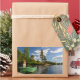 Rechteckiger Aufkleber aus einem kleinen, grünen Foto und einer Holzhütte mit einigen hohen Bäumen am Ufer des Wassers in einer Fjordlandschaft in Byglandsfjord, Norwegen.
