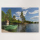 Puzzle mit einem kleinen grünen Boot und eine hölzerne Kabine mit einigen hohen Bäumen am Rand des Wassers in einem Fjord gestalten in Byglandsfjord, Norwegen landschaftlich.